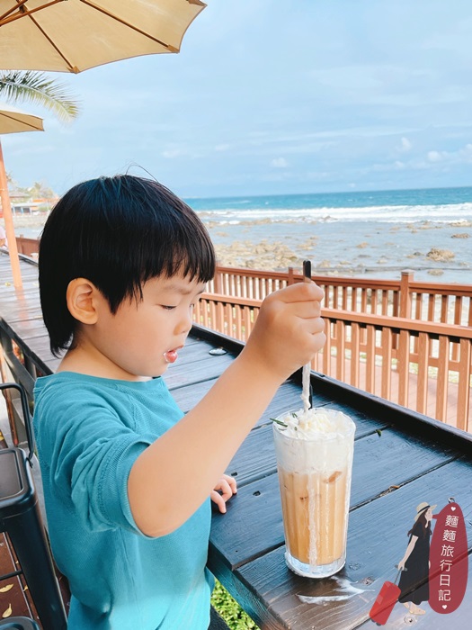 逐浪海景咖啡木棧道連接著富山護漁區入口,超級方便,喝完飲料就可以帶著小孩去沙灘走走、看魚囉!