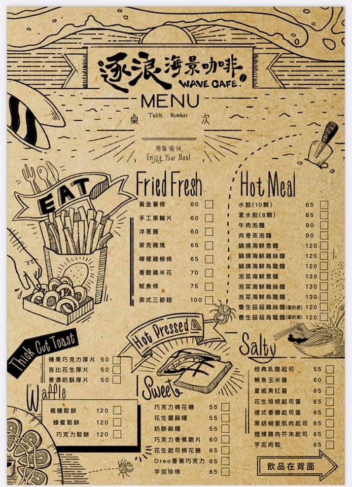 逐浪海景咖啡提供的餐點有炸物小點心、鬆餅吐司,還有水餃泡麵跟鍋燒意麵,飲料也是滿滿的一整頁,有咖啡拿鐵、各式茶飲、果汁等選擇。