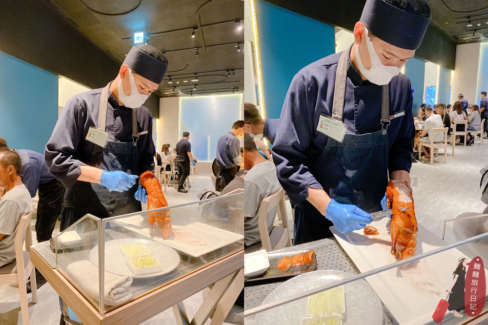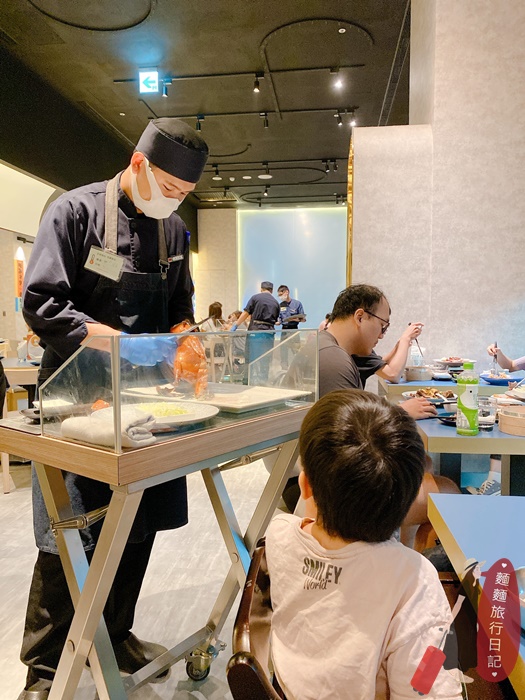 烤鴨上場~師傅會推著餐車到桌邊現切烤鴨!波仔跟樂樂再次目不轉睛地盯著看🤣。