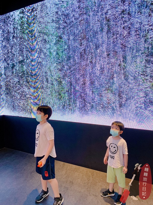 入口處有一個巨無霸3D瀑布水幕,不停傾流而下,一整個氣勢磅薄很有震撼感!波仔跟樂樂表情超可愛,整個被震住,目不轉睛地盯著看!餐廳想要創造出花東縱谷的瀑布感~~~意外變成拍照打卡景點!