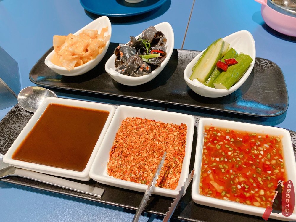 點完餐後會先送上吃烤鴨的醬料,左至右分別是特製甜麵醬、花椒鹽、季節沾醬,還有兩人套餐的開胃菜涼菜三拼,由左至右分別是黃金泡菜、、腐乳雲耳、椒麻川味黃瓜,泡菜都很開胃好吃!