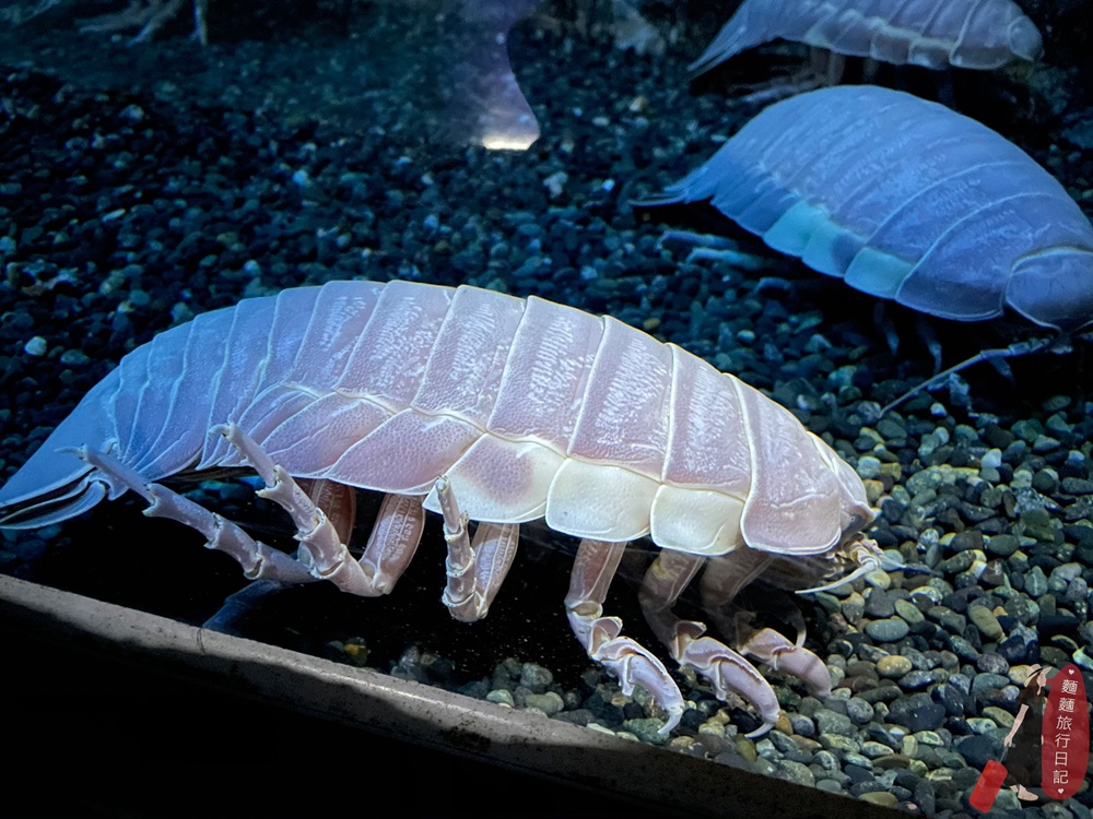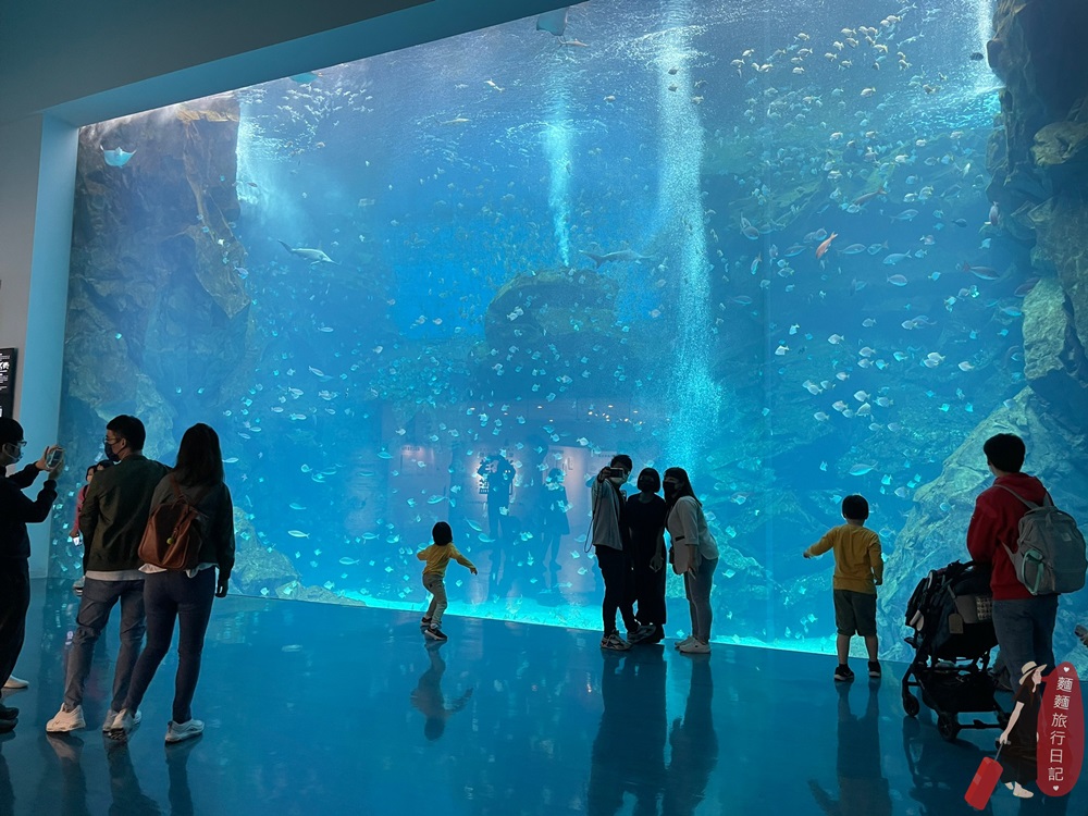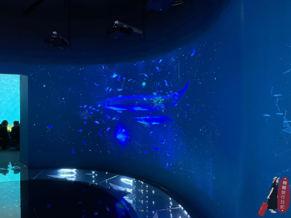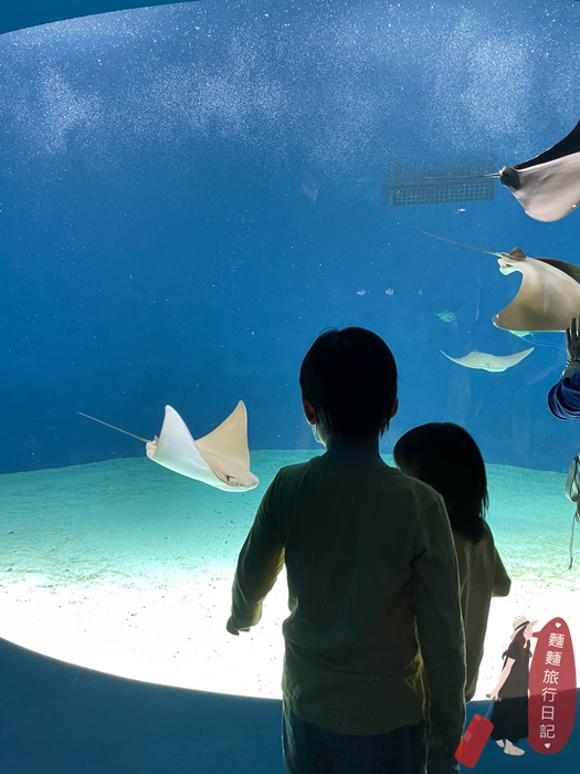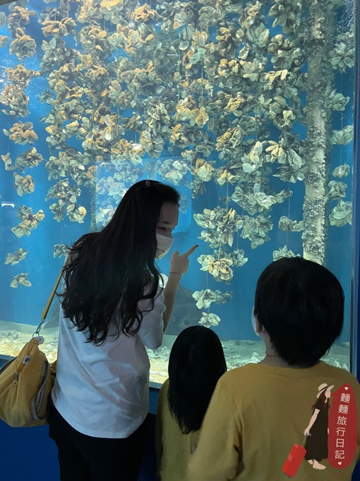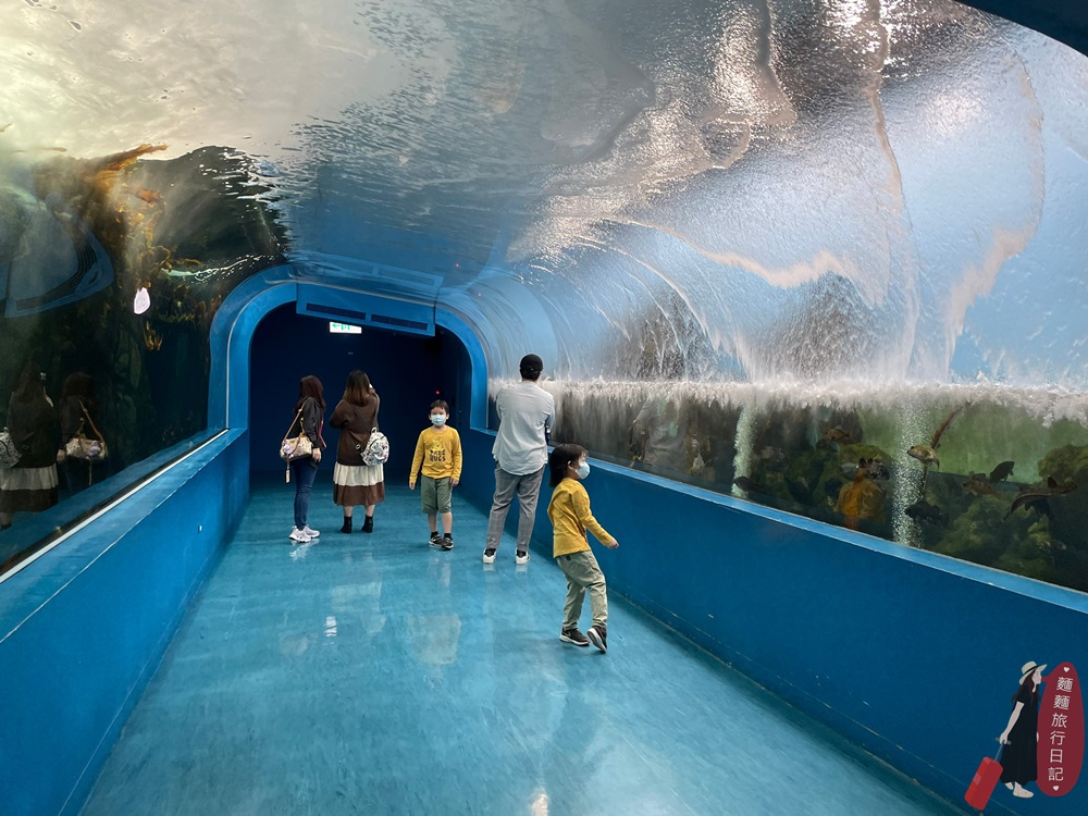 這是一個造浪場景的海底隧道,裡面有海帶跟滿滿的海底生物,海浪模擬的很逼真欸!