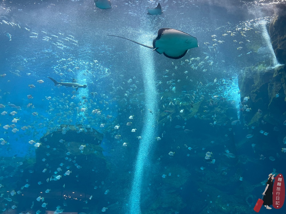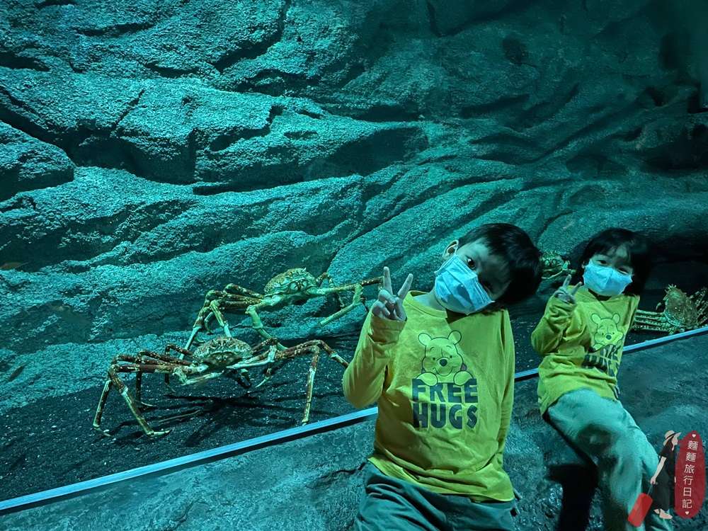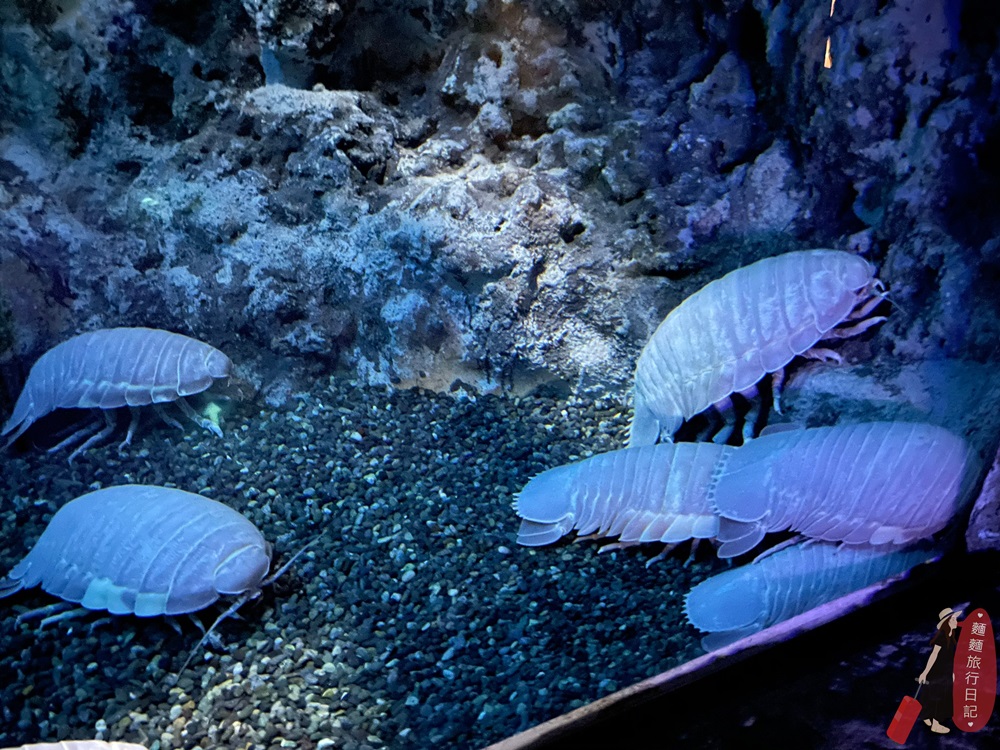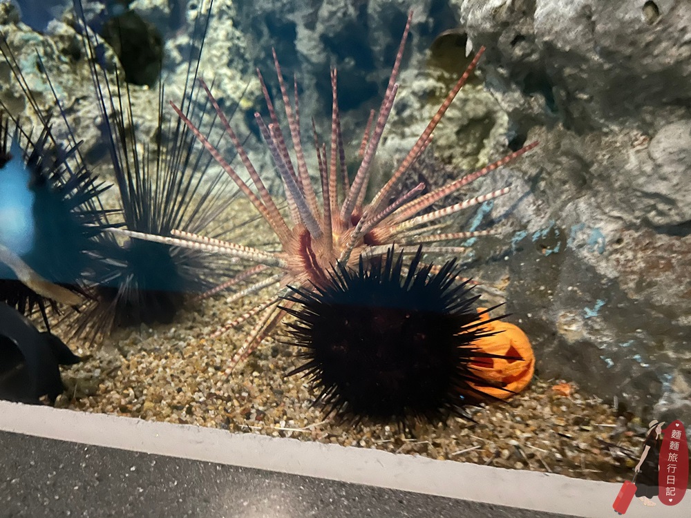 這是一個造浪場景的海底隧道,裡面有海帶跟滿滿的海底生物,海浪模擬的很逼真欸!