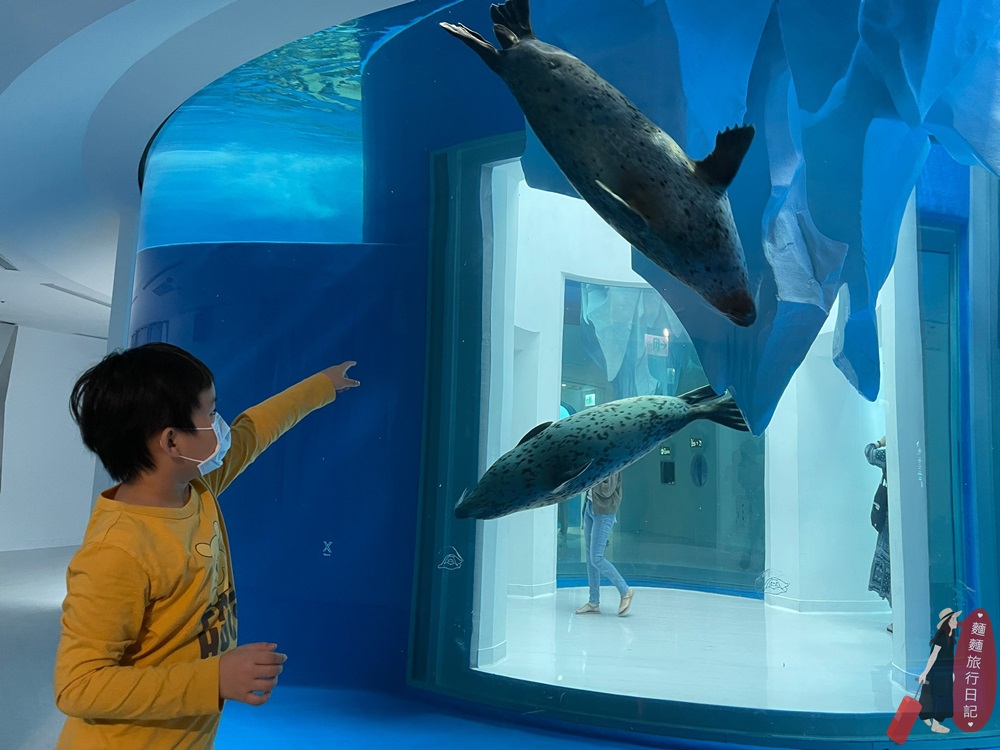 下個展區是寒帶行凍,海豹在冰冷的海域超級自在舒適,在360度透明水族箱可以看見海豹優雅的游泳。