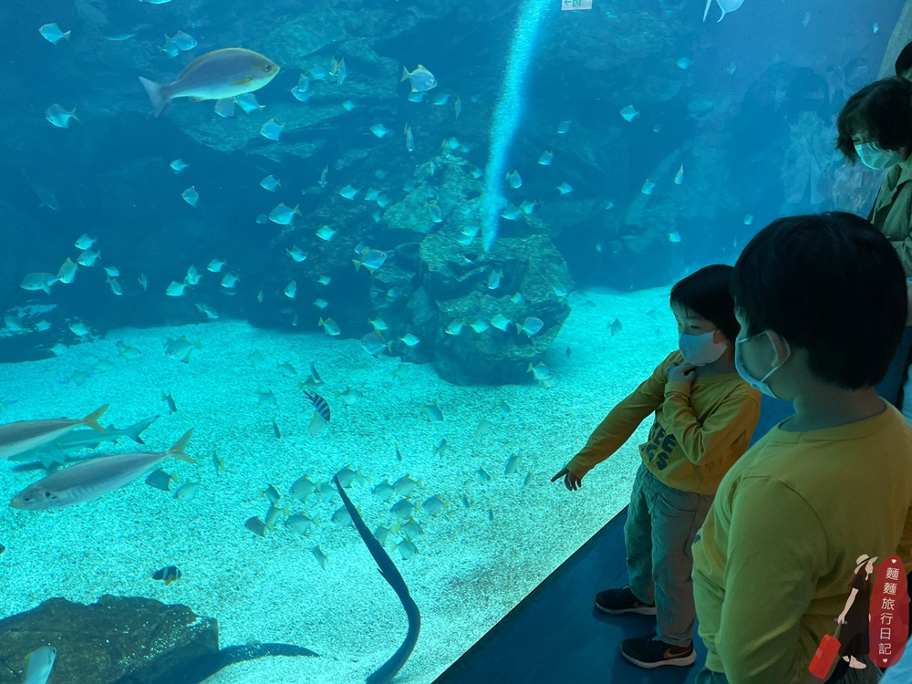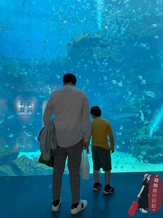 人潮逐漸散去後,波樂兩人依舊被超大水族箱吸引,看得目不轉睛!裡面的魚滿多的,但都不大小小的就是了!