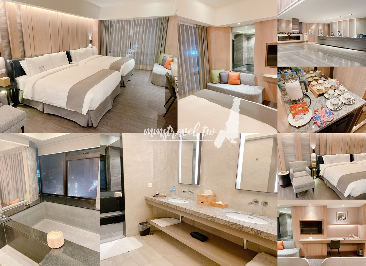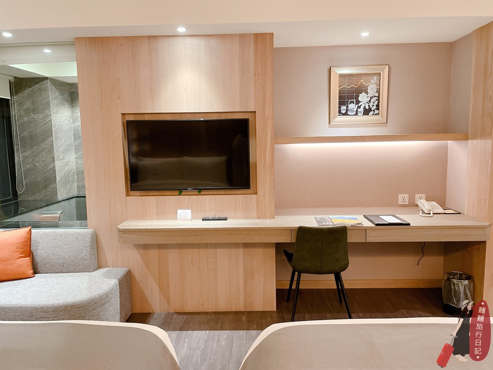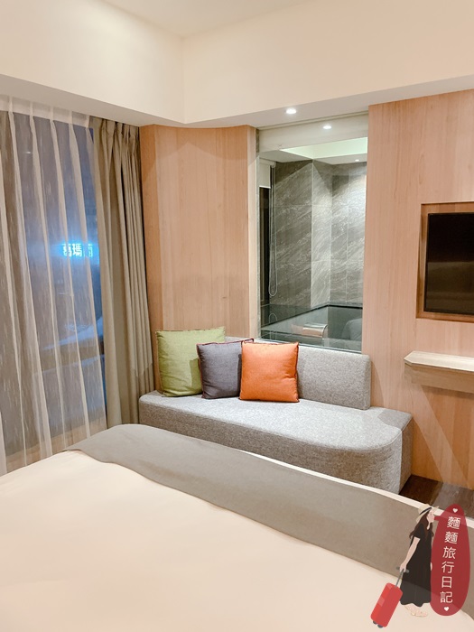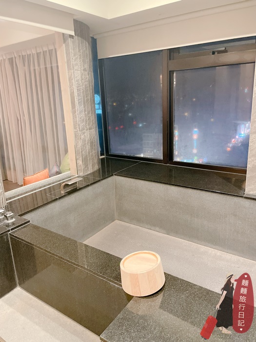 落地窗邊還有另一個沙發區,可以坐在沙發椅上眺望窗外街景,就是一望無際的街道美景,房間內泡湯浴池設計成透明窗,從房間就可以清楚看到浴池泡湯狀況,這個設計也相當安全,不論是小孩還是大人泡溫泉都不宜泡太久!