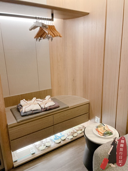 山形閣溫泉飯店房型是正四方形,一進門不是狹長形的玄關,直接就是房間囉!與門並排的有茶水櫃跟衣櫃,衣櫃有放可以穿去2樓大眾湯屋的浴衣跟拖鞋。