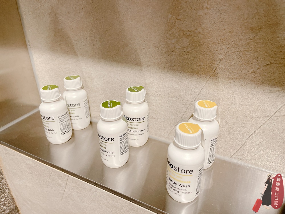 淋浴區的牆面有一個放洗澡備品的空間,一樣也是一整組的紐西蘭有機品牌ecostore有洗髮、潤髮、沐浴乳。