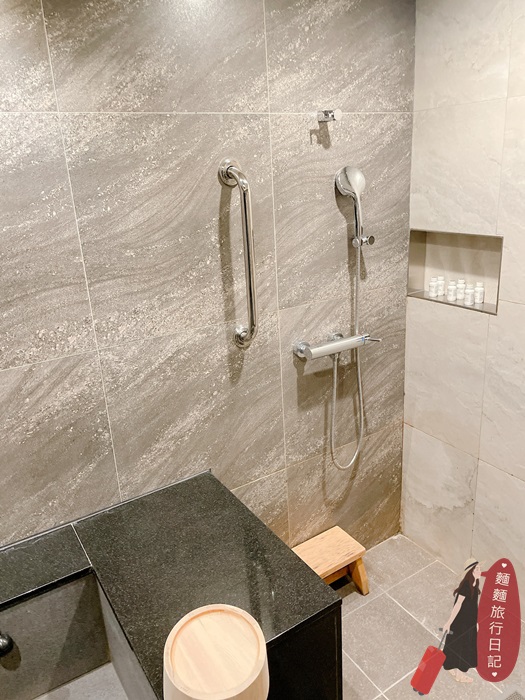 大浴池旁邊就是洗澡淋浴的地方,還有一個可以坐著洗的小凳子!很日式呀!