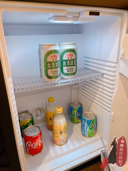 茶水櫃下方的櫃門打開裡面是一個小冰箱,飲料都是免費提供,有汽水、養生豆漿、運動飲料(泡完湯脫水可以喝)、啤酒,不管是大人小孩入住都顧到每個人的喜好!