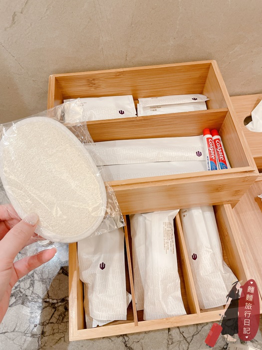 雙洗手台中間整齊的收納了備品,相當齊全,有提供小朋友的牙刷。
