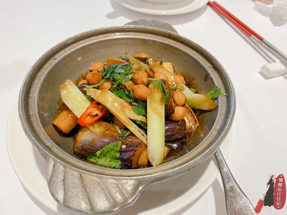 喜歡吃茄子的人不能錯過蠔油淮山茄香煲,吃起來的味道就是三杯雞啊!茄子裡還有塞山藥,軟嫩的茄子加上爽脆的山藥,And三杯九層塔香的調味,讚啦!那個一粒一粒的是應眼豆。