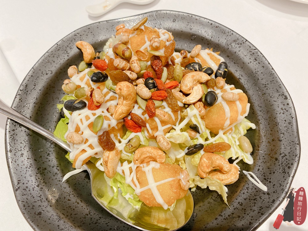 素食版的鳳梨蝦球~蝦球是用紅毛丹跟鳳梨做的,下面撲滿羅曼生菜,最後在灑上各式堅果,整理是清爽好吃的,加上堅果很香~