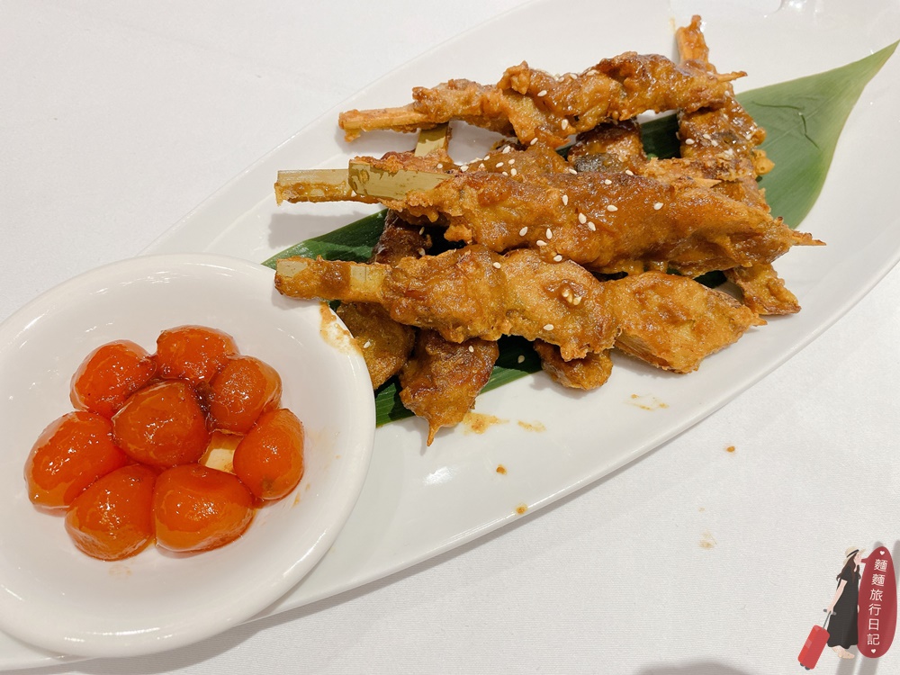這不是肉這是用杏鮑菇途上南洋風味的醬料火烤出來的串燒料理,咖哩味十足,烤過的杏鮑菇還非常多汁,話說我們好像默默的點了很多杏鮑菇料理欸!旁邊那盤也不是鹹蛋黃或是醃製番茄,是蘿蔔喔!看到的跟心裡想的都不是原本的食物啊!吃進嘴裡才會恍然大悟,廚師厲害的除了幫食物變裝外,還顛覆了味覺啊!我有時候吃完還不知道那是什麼欸~白活了(笑),但真的都是好吃的。