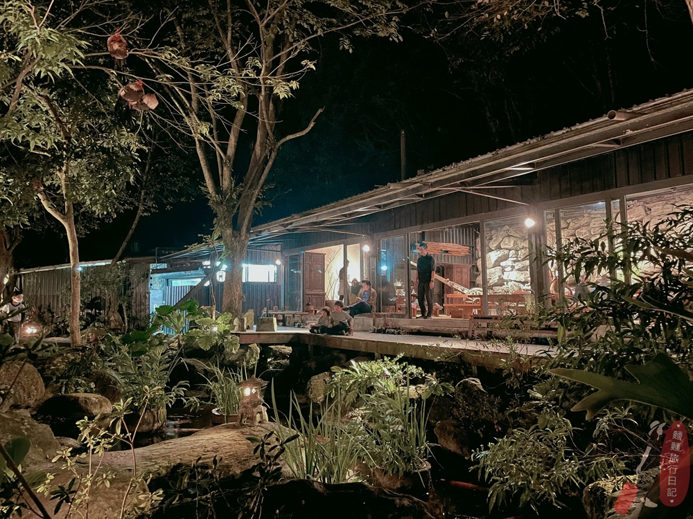 吃完飯後三兄弟就坐在庭院看魚(大猴看手機),另一頭是山下可以看夜景唷!我看大家白天來的景色也超美,晚上只有5:00跟19:00這兩個時段可以預約,建議大家早點來用餐,下山比較不危險。