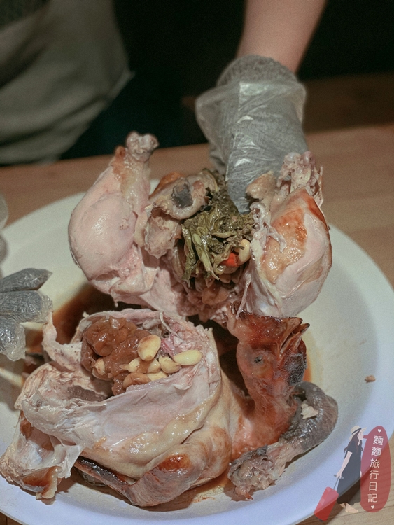 大家看看大猴庖丁解雞,雞的肚子裡塞了滿滿的梅子、辣椒跟蒜頭,香味一絕!雞肉真的又油又香又好吃,就連波仔都讚嘆怎麼會有這麼嫩的雞啊,瘋了瘋了……
